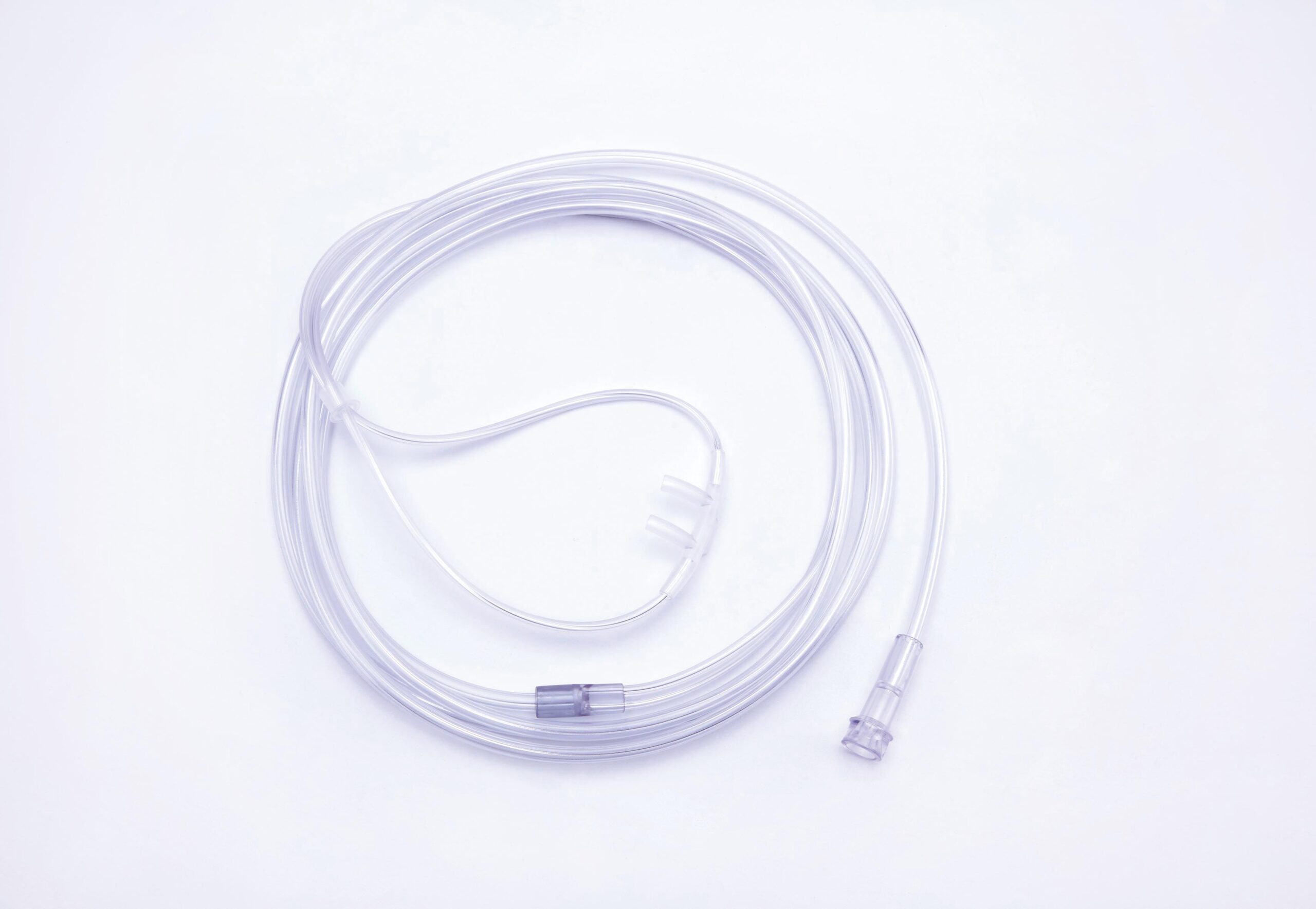 The nasal cannula is a device used to deliver supplemental oxygen or airflow to a patient or person in need of respiratory help. This device consists of a PVC plastic tube which fits behind the ears, and a set of two prongs which are placed in the nostrils.